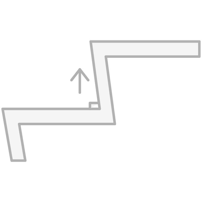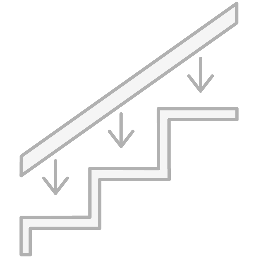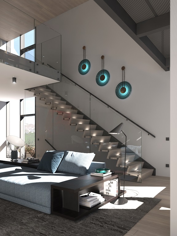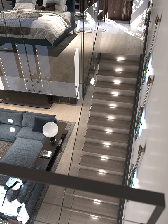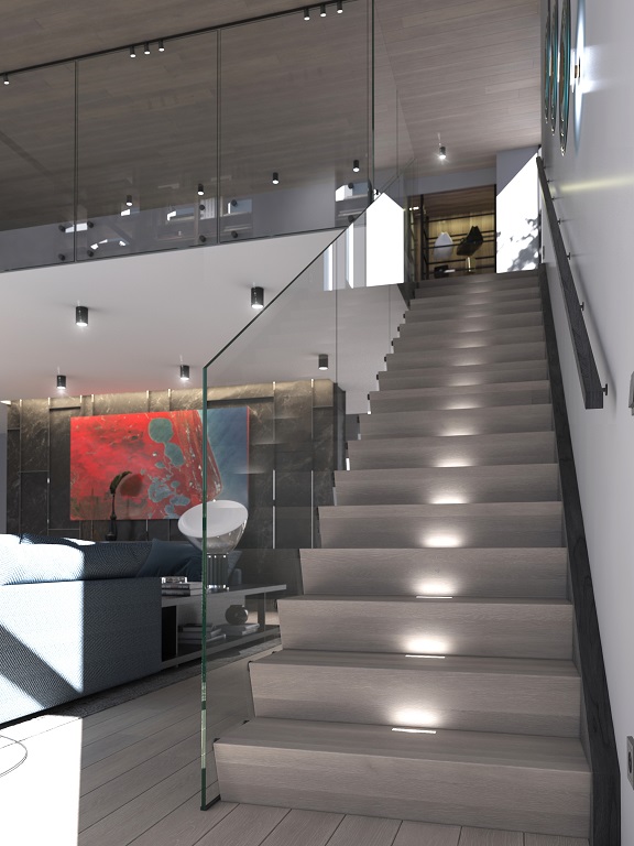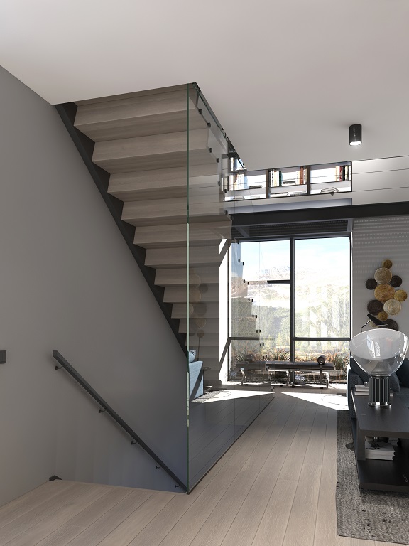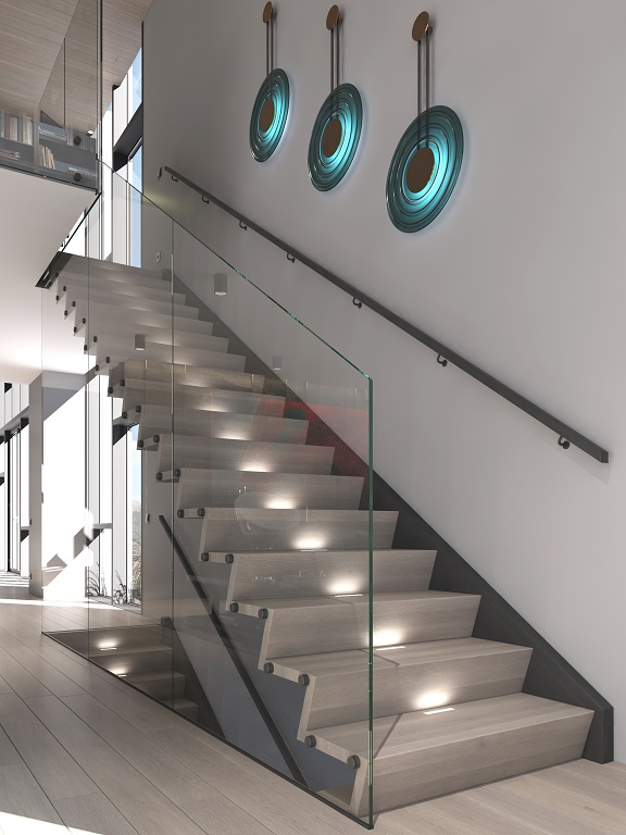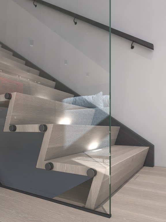 I-form med lukkede Z-trinn og ledbelysning. Lukket trevange mot vegg (60mm tykkelse) som skaper svevende trinn. Håndløper på vegg i tre. Glassrekkverk er sidemontert på trinn med avstandsbolter, hvor glass går helt ned til gulv. Denne typen glassvegg anbefales dersom man ønsker å lukke trappeløpet, og samtidig bevare det åpne rommet under trappen.