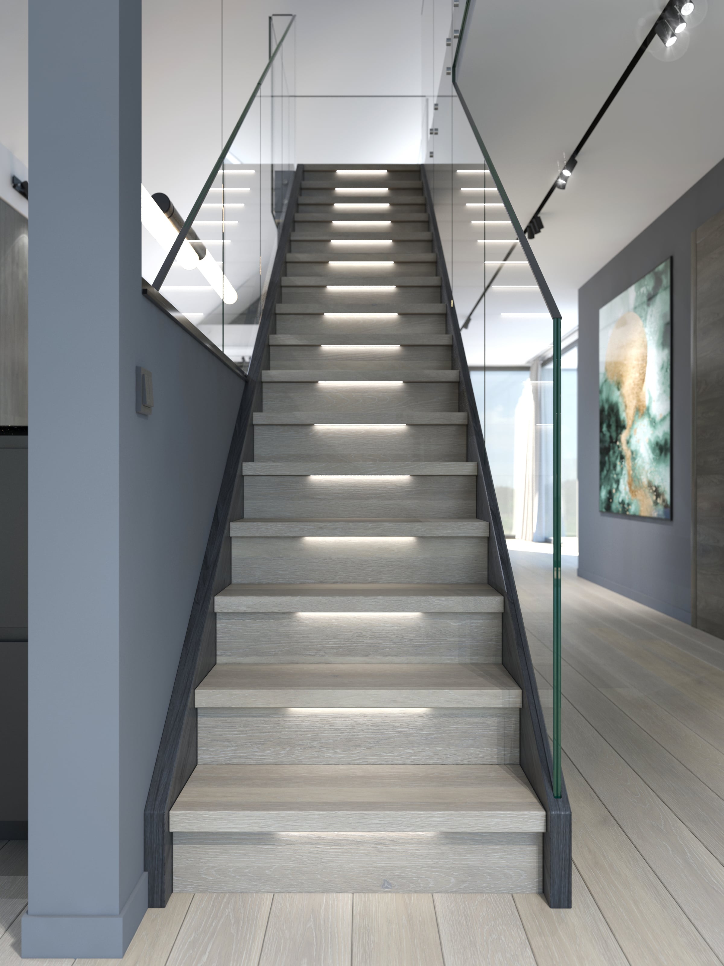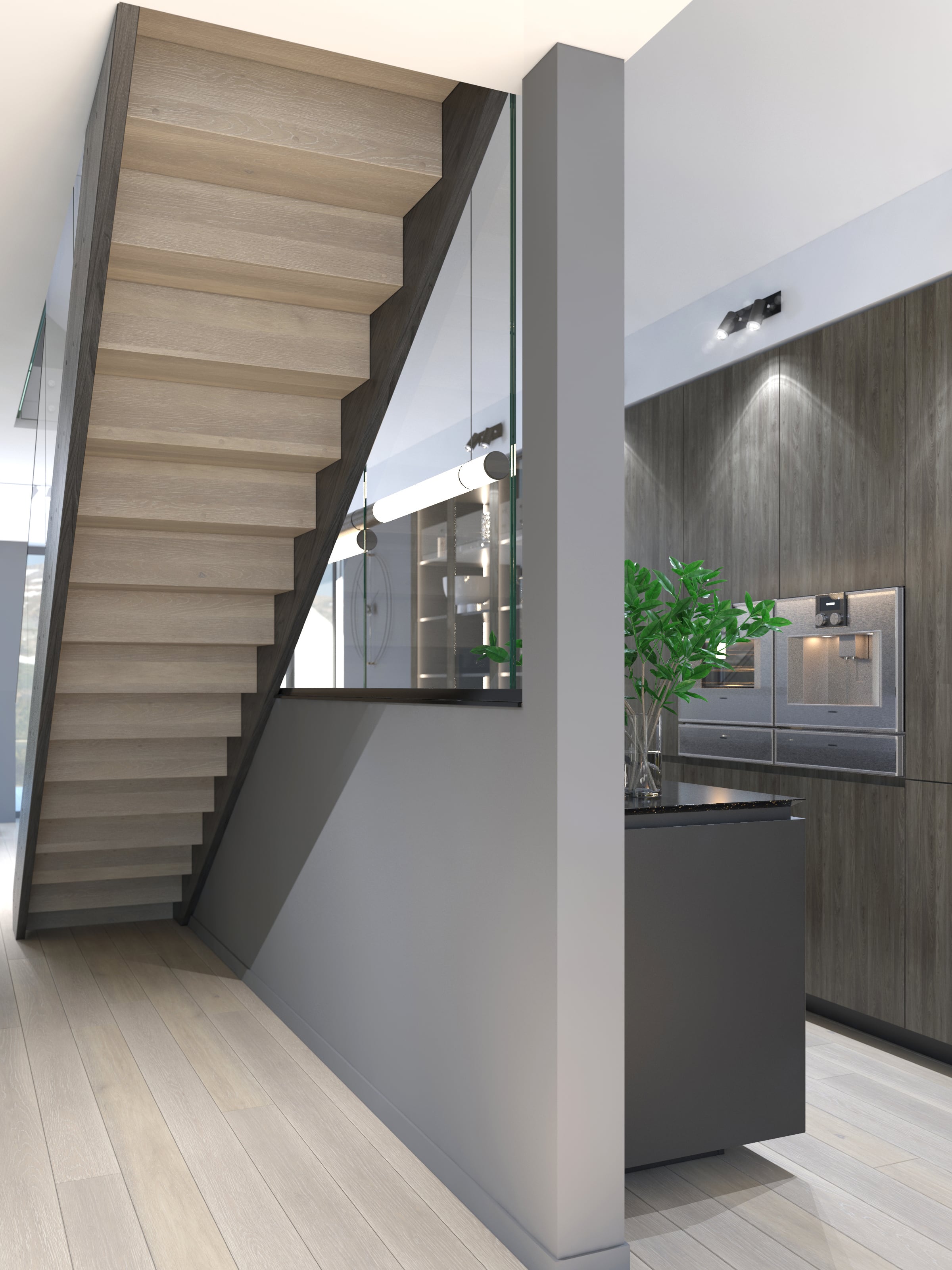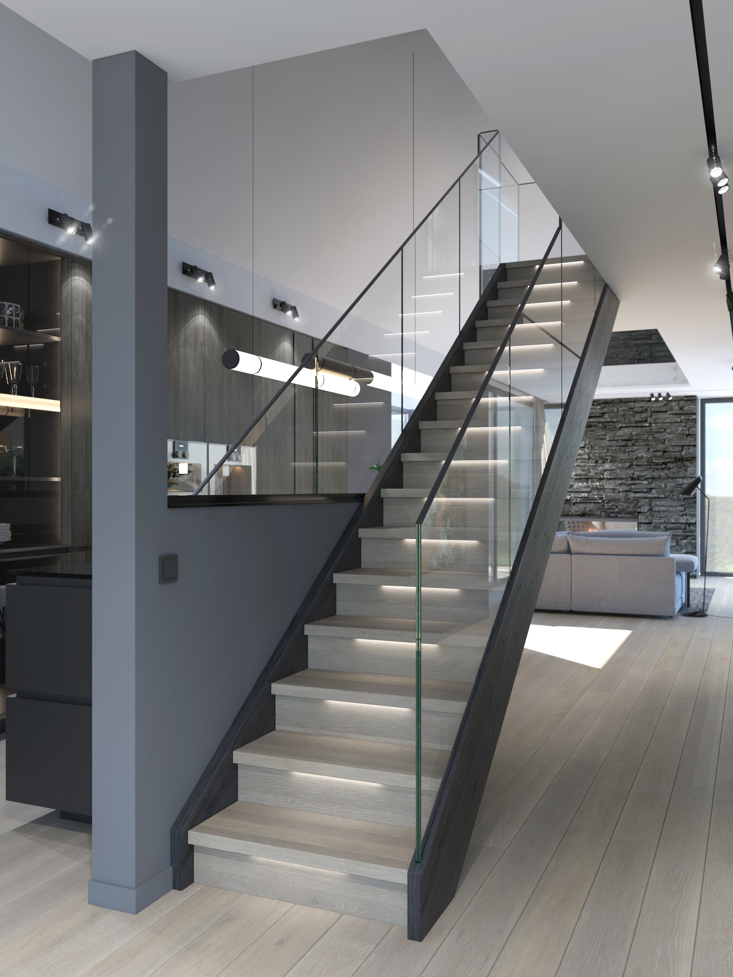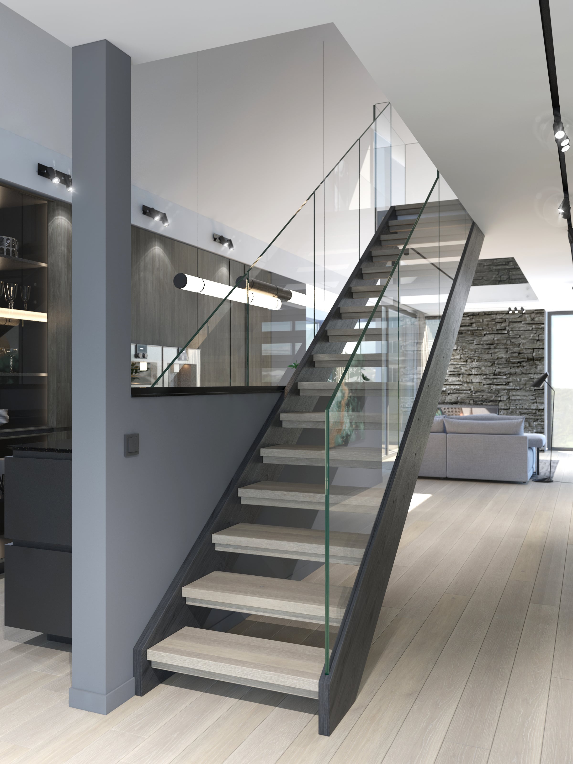 I-form med lukkede vanger på begge sider. Åpen trapp med 39mm tykke inntrinn og barnesikrsingslist, for å ivareta regulering i forhold til sikkerhet. Solid glassrekkverk av høy kvalitet som er integrert i vange, uten overliggende håndløper. Dette er med på å bevare det åpne og moderne uttrykket.