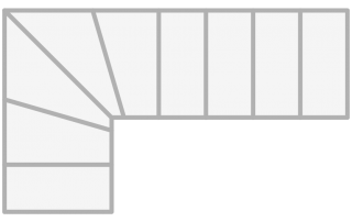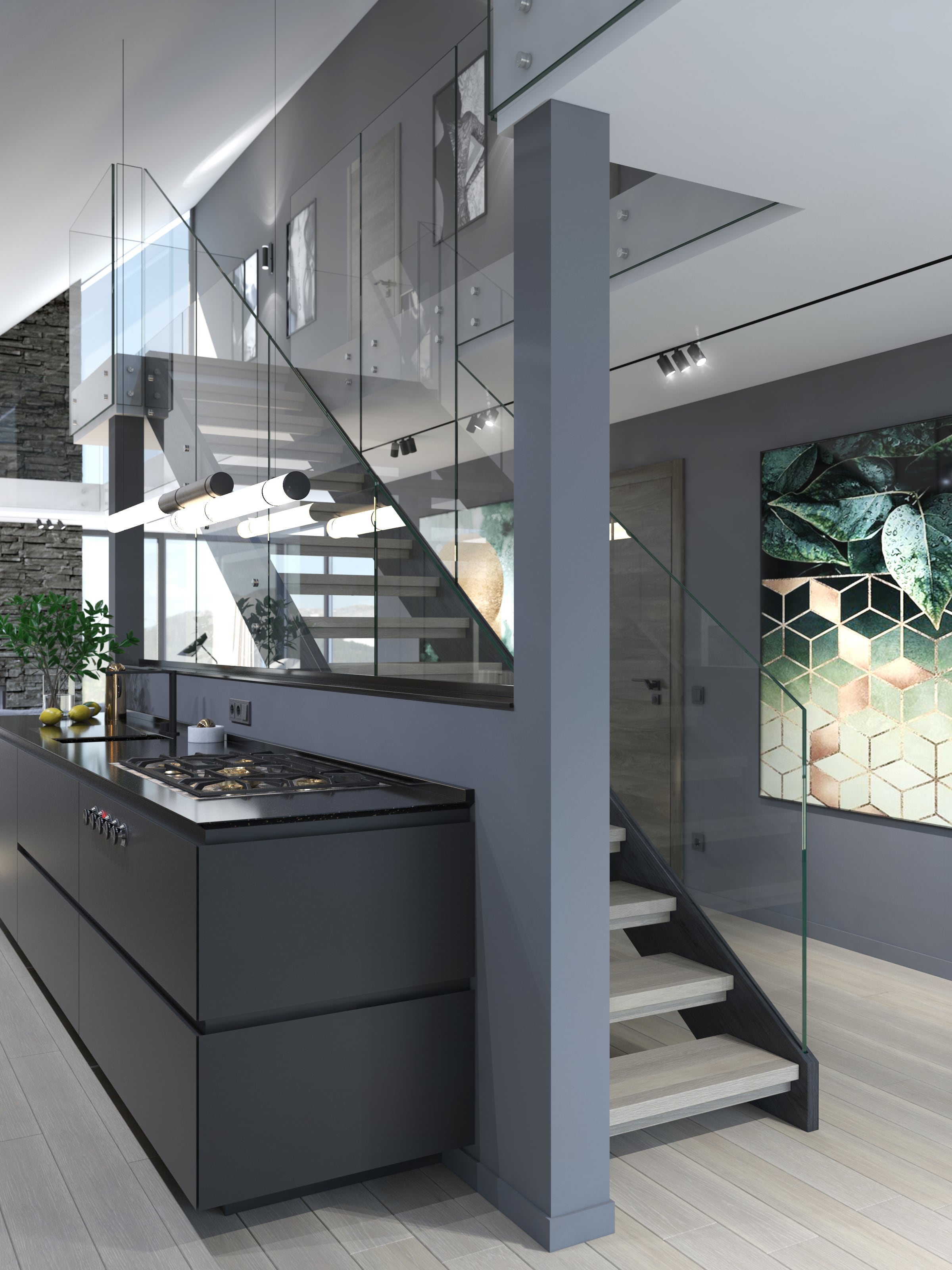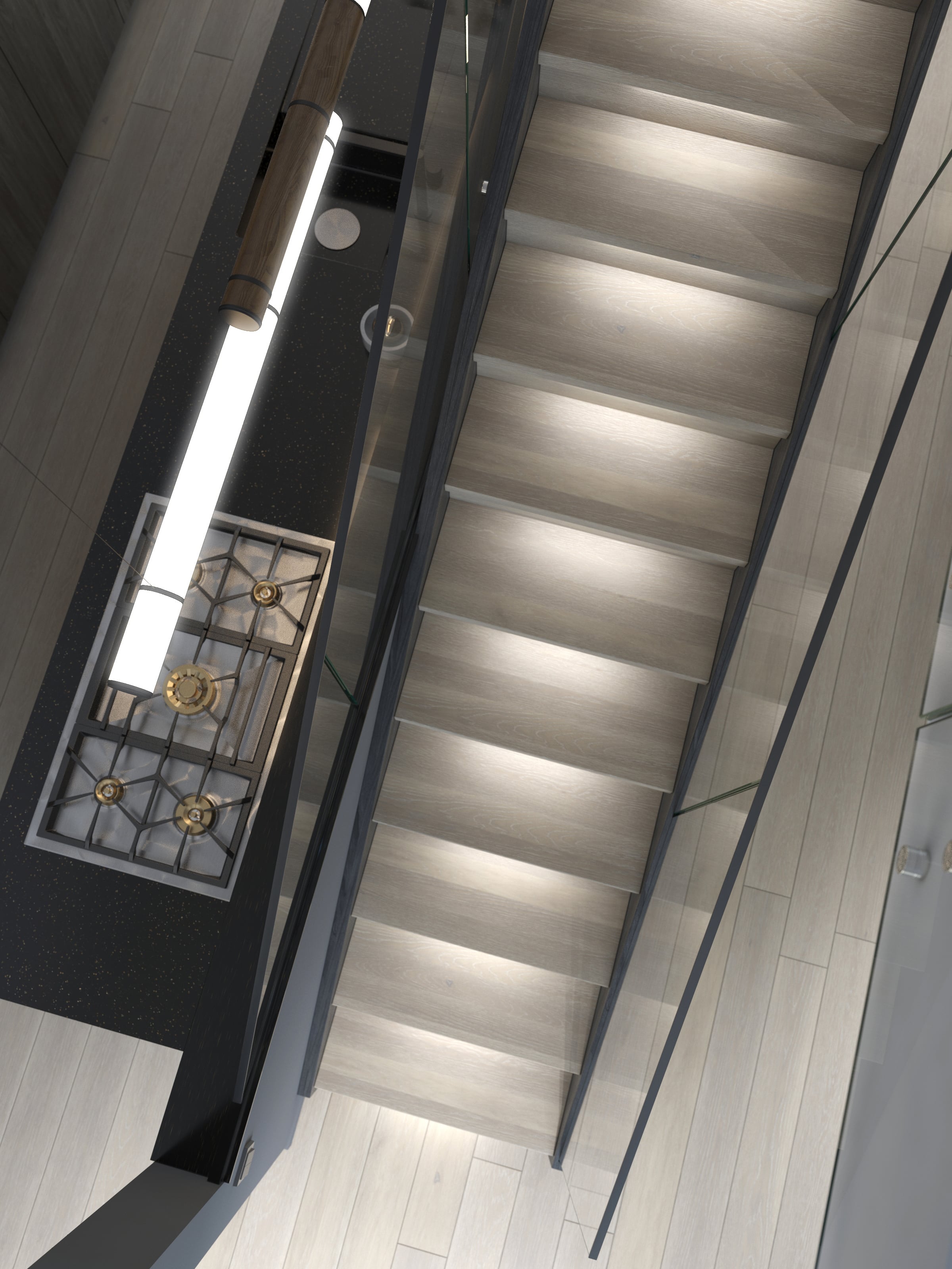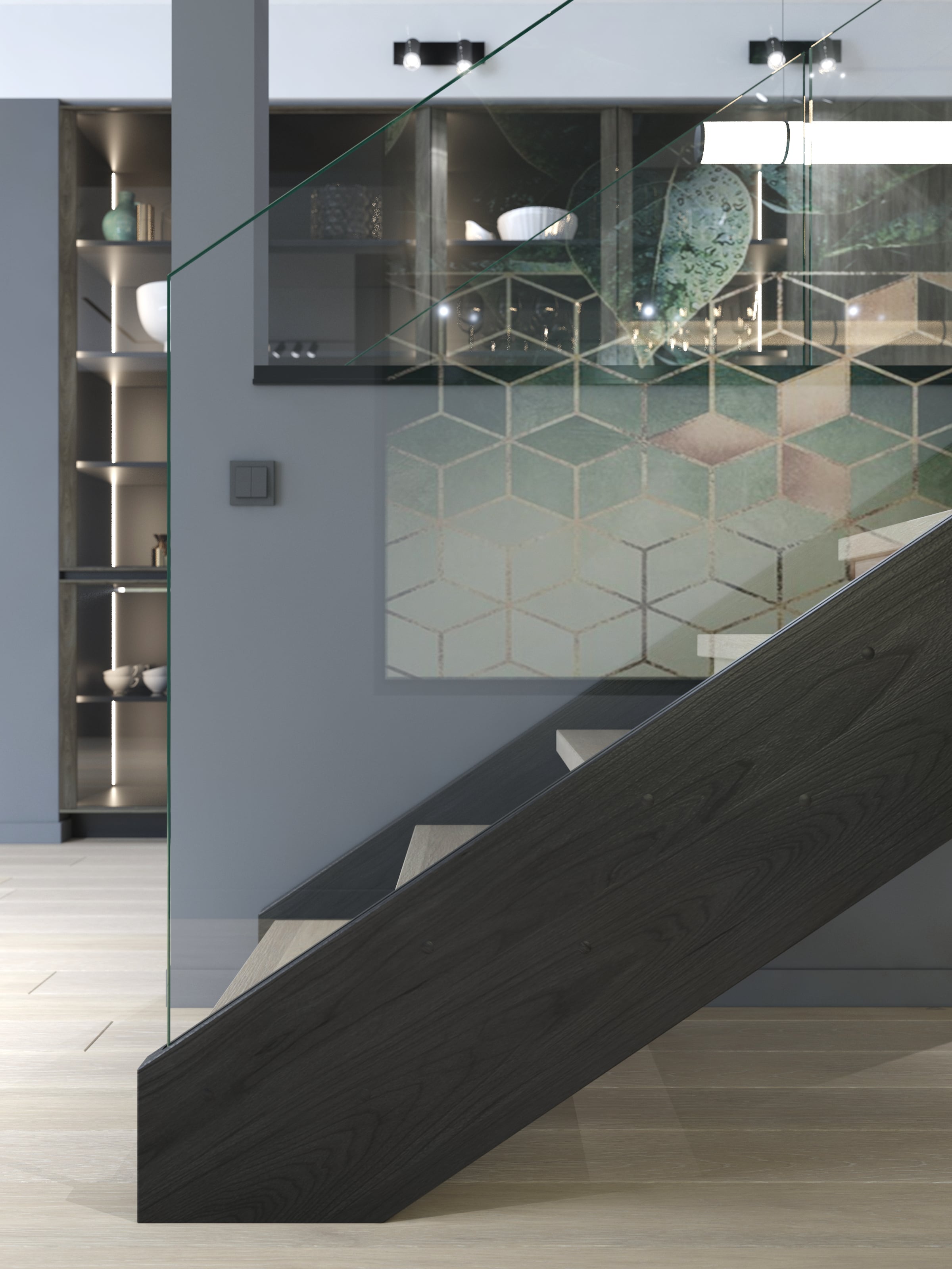 I-form med lukkede vanger på begge sider. Åpen trapp med 39mm tykke inntrinn og barnesikrsingslist, for å ivareta regulering i forhold til sikkerhet. Solid glassrekkverk av høy kvalitet som er integrert i vange, uten overliggende håndløper. Dette er med på å bevare det åpne og moderne uttrykket.