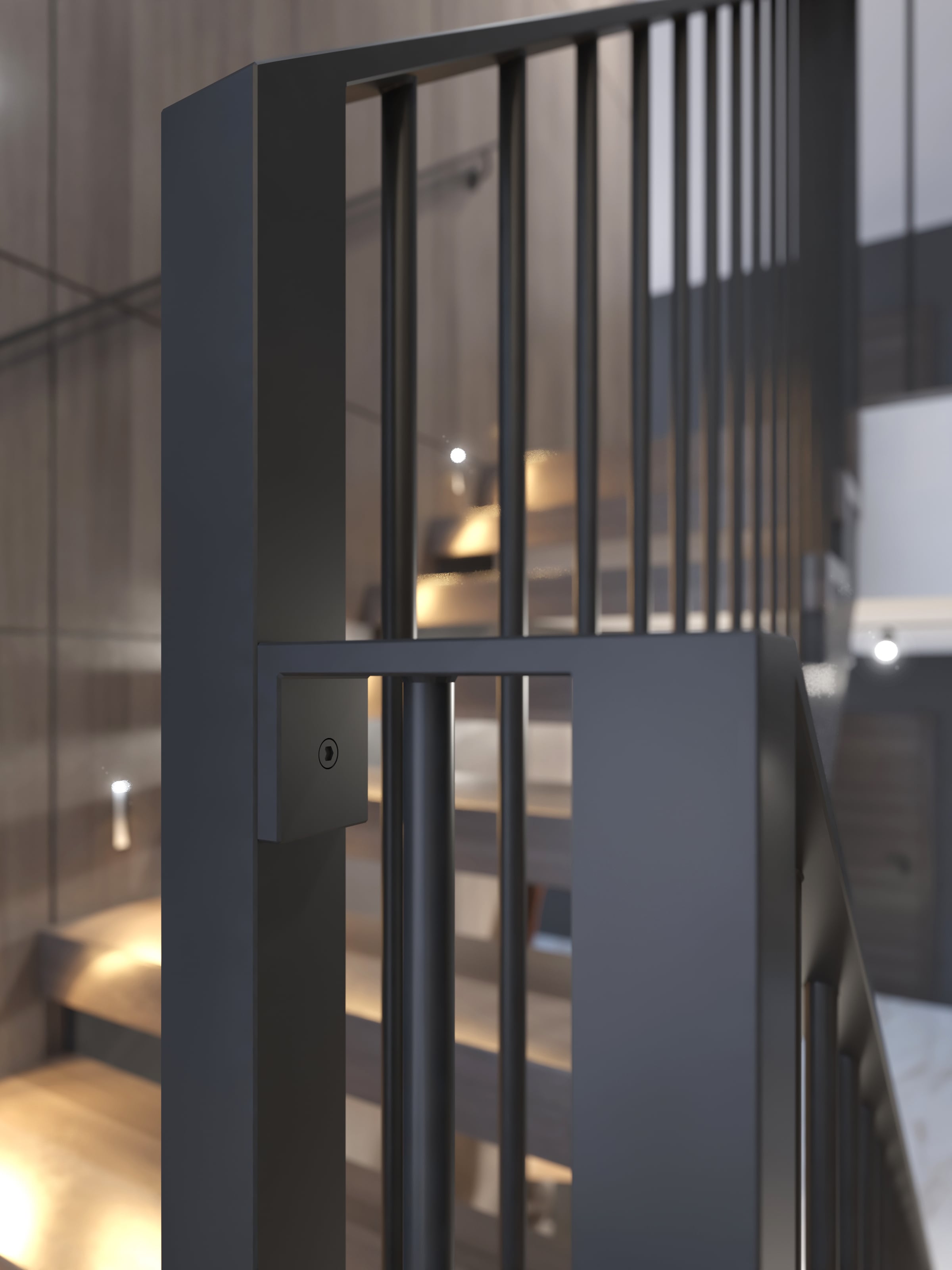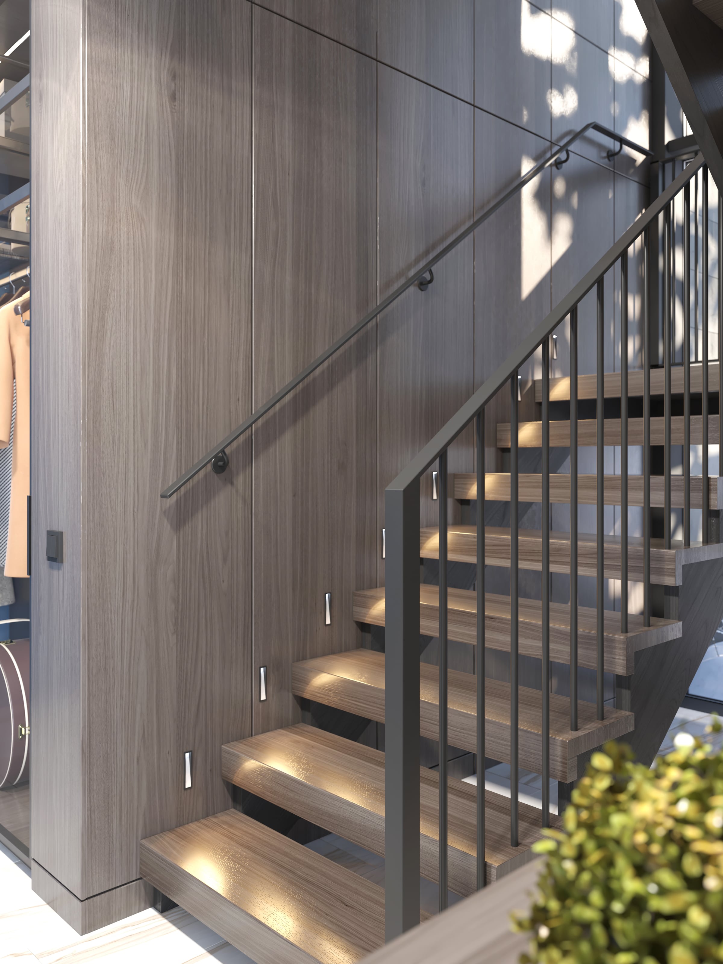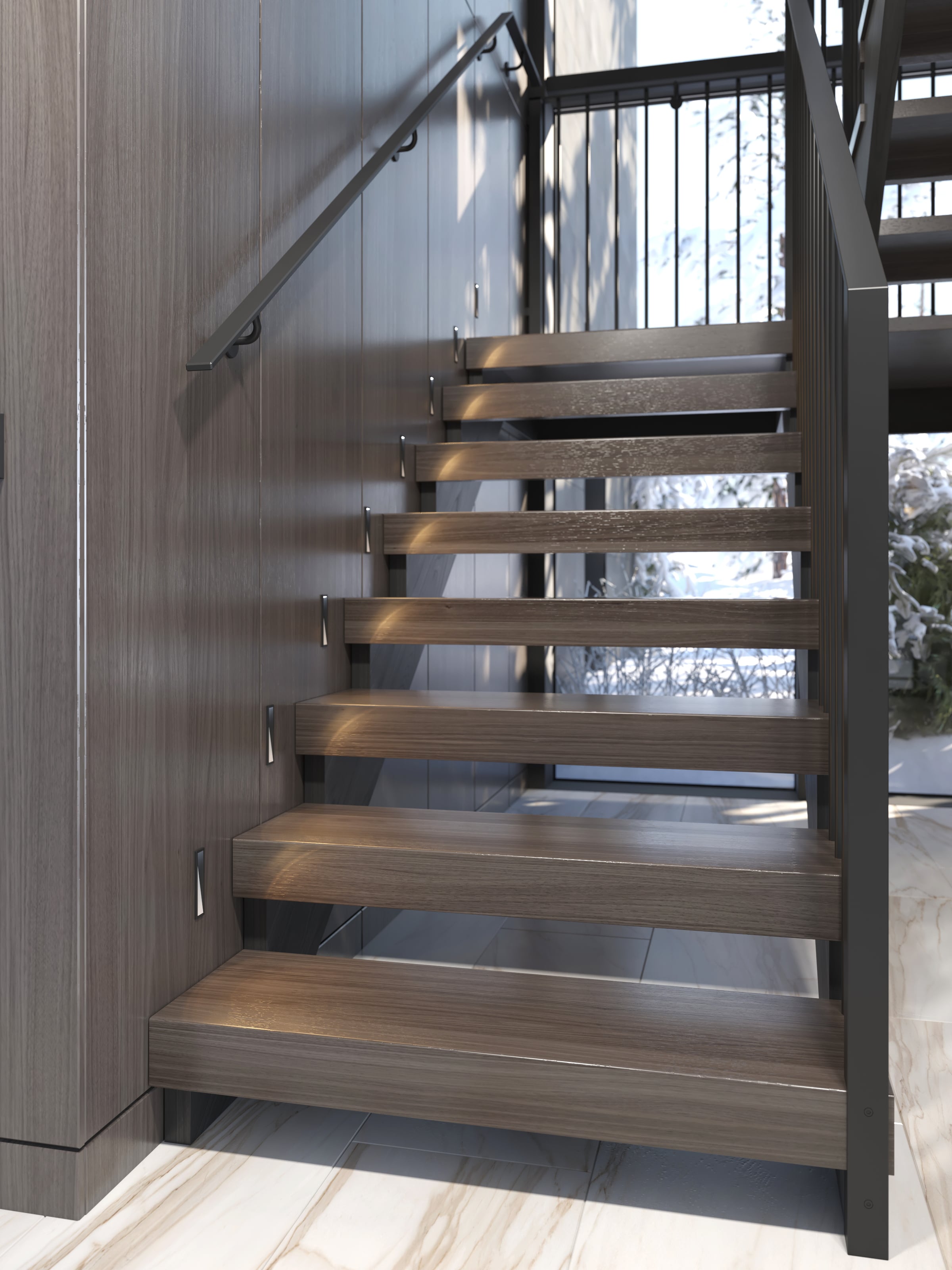 U-form med repos. Underliggende vanger i tre på begge sider. Trinnene har L-formet barnesikringslist for å ivareta regulering i forhold til sikkerhet, og bidrar også til å skape et inntrykk av massive trinn i front. Spiler, stopler og håndløper i metall.