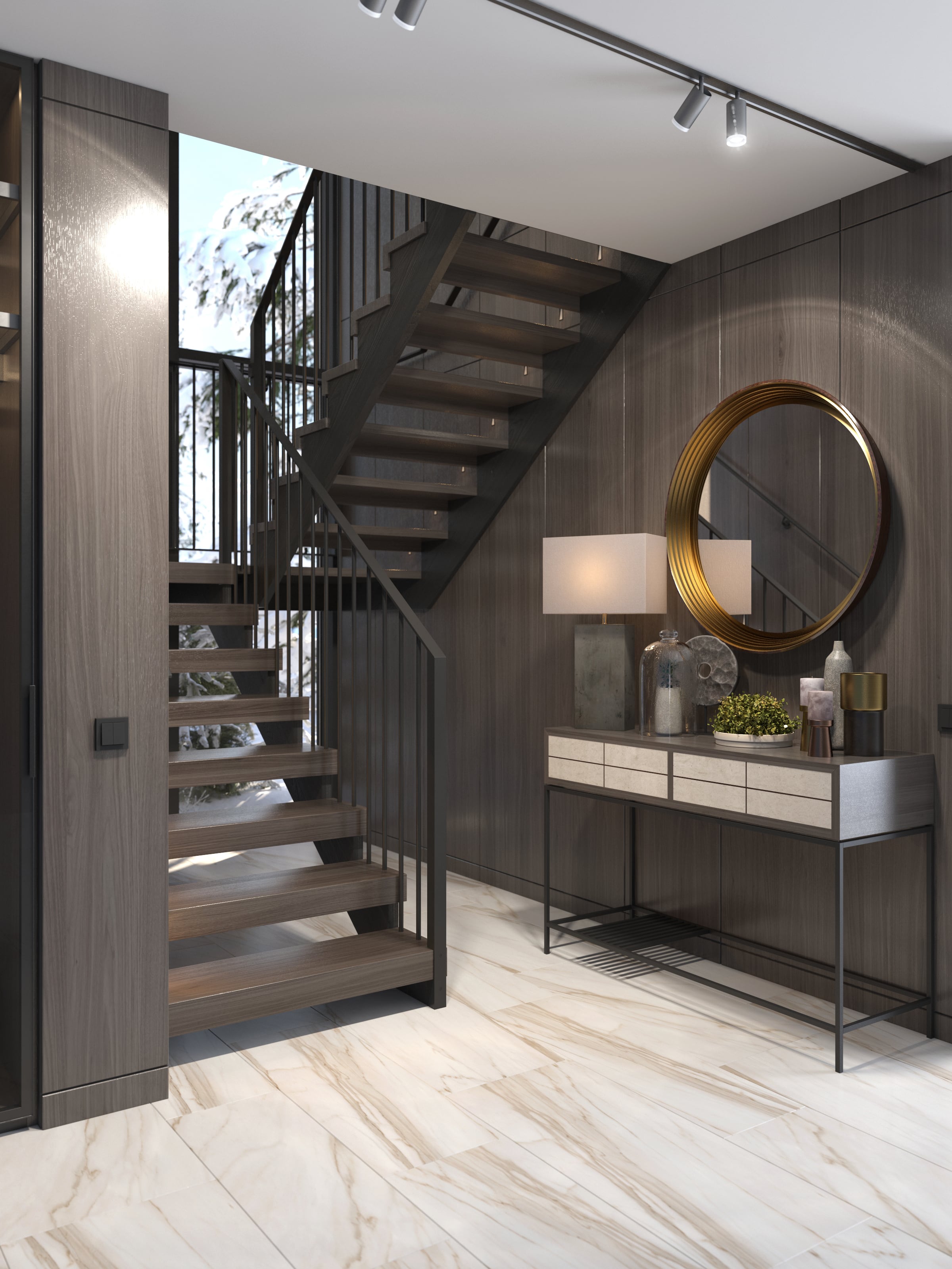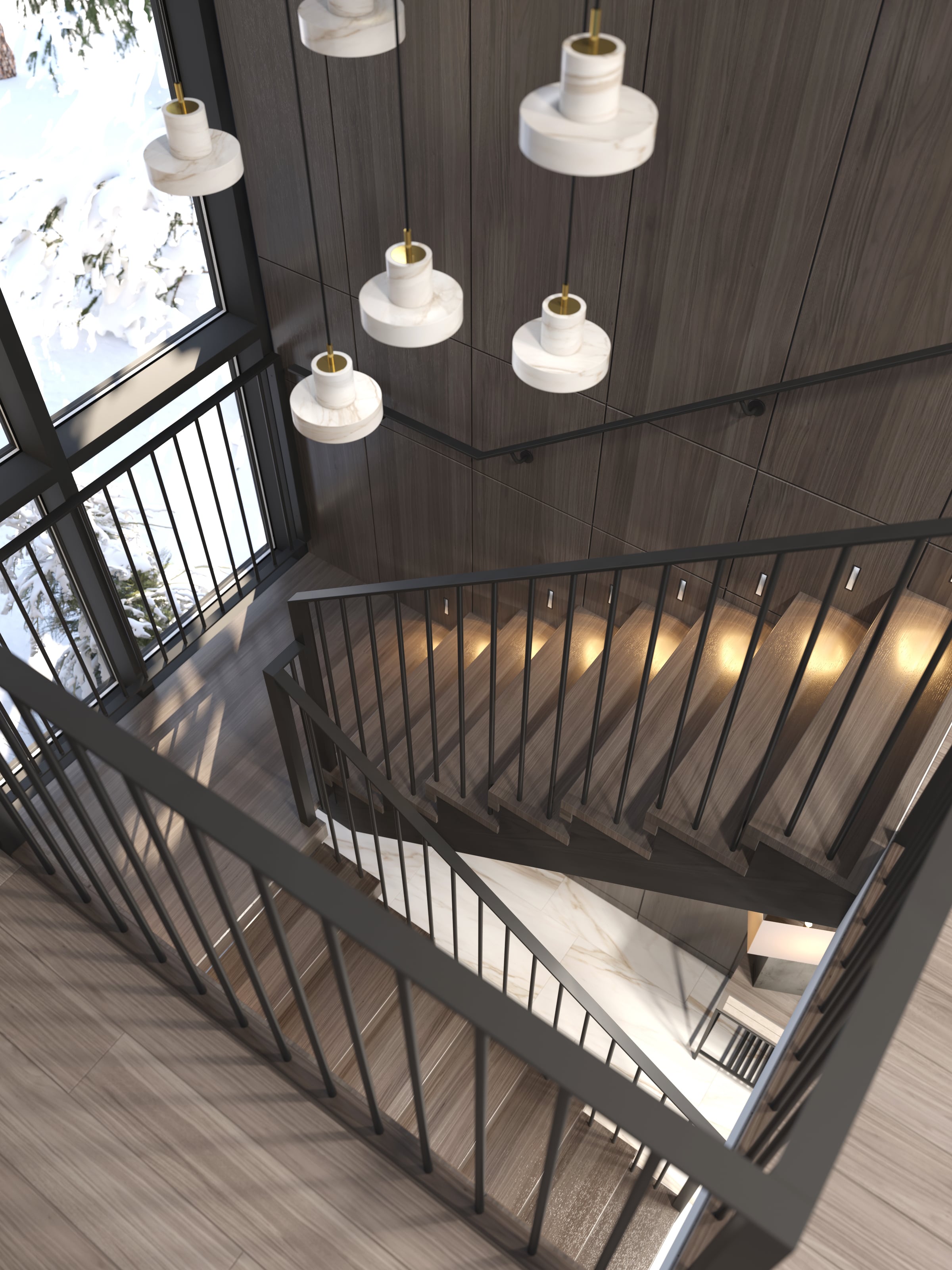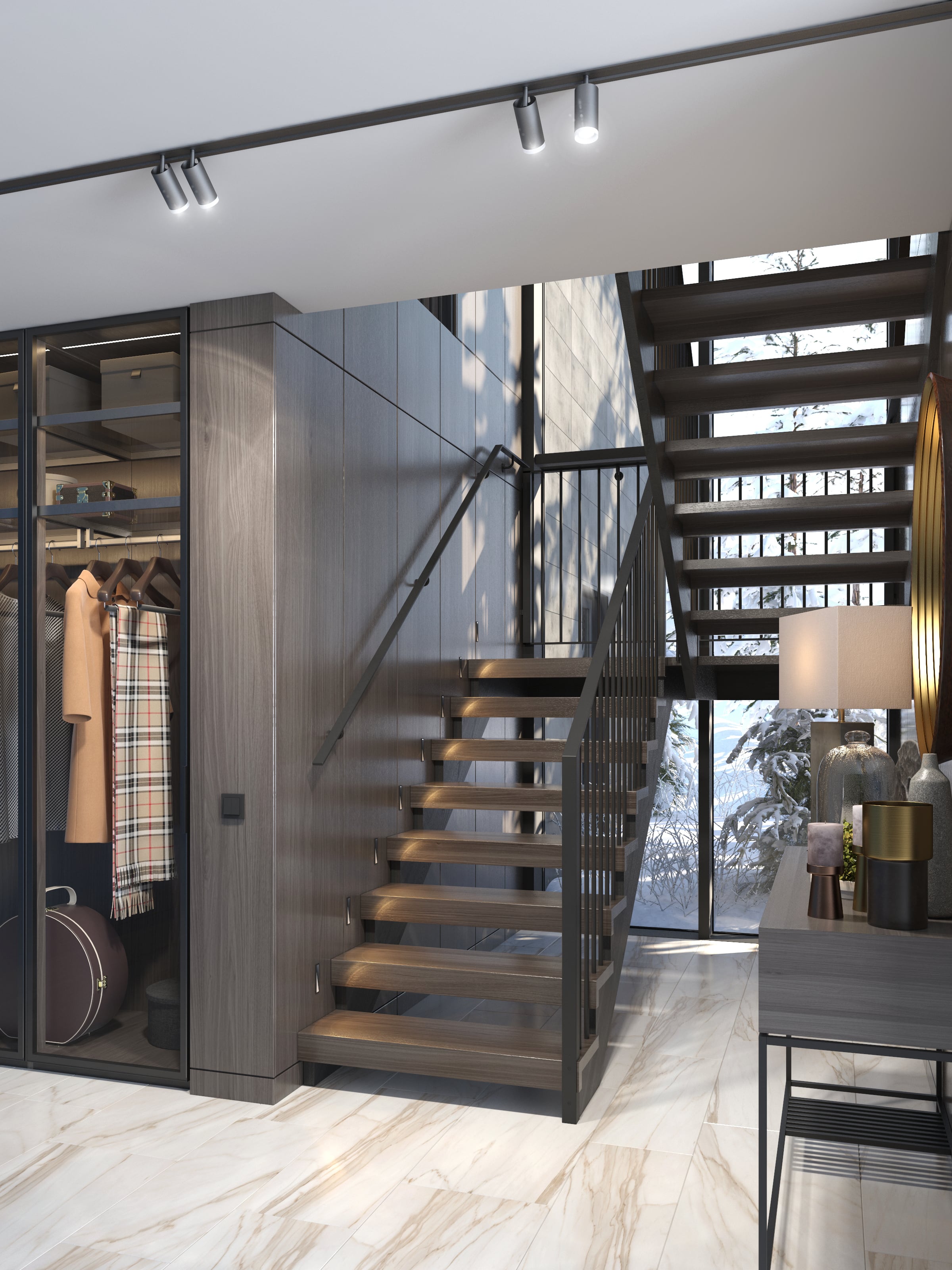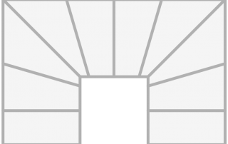 U-form med repos. Underliggende vanger i tre på begge sider. Trinnene har L-formet barnesikringslist for å ivareta regulering i forhold til sikkerhet, og bidrar også til å skape et inntrykk av massive trinn i front. Spiler, stopler og håndløper i metall.